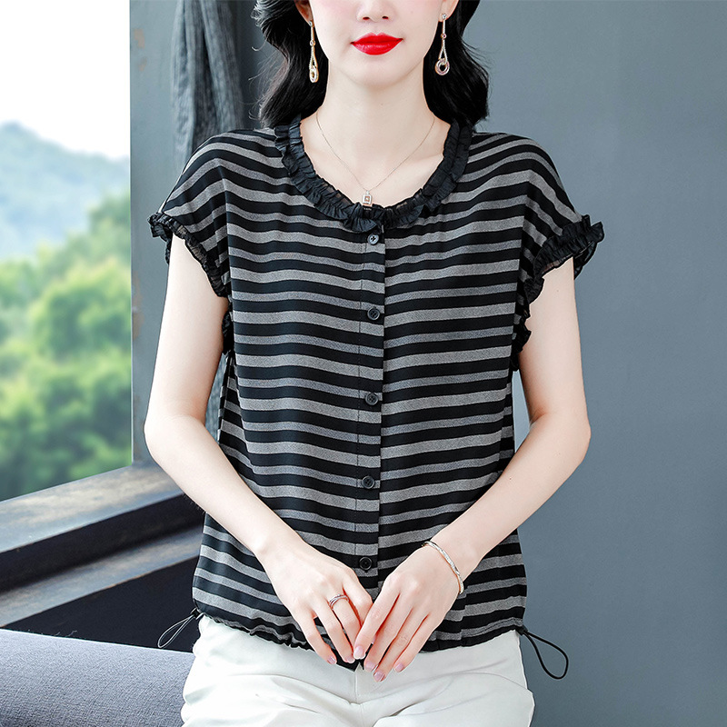 おしゃれなママ服、耳付きストライプ半袖シフォンシャツ、夏の新作お腹カバー痩身シャツ、婦人服