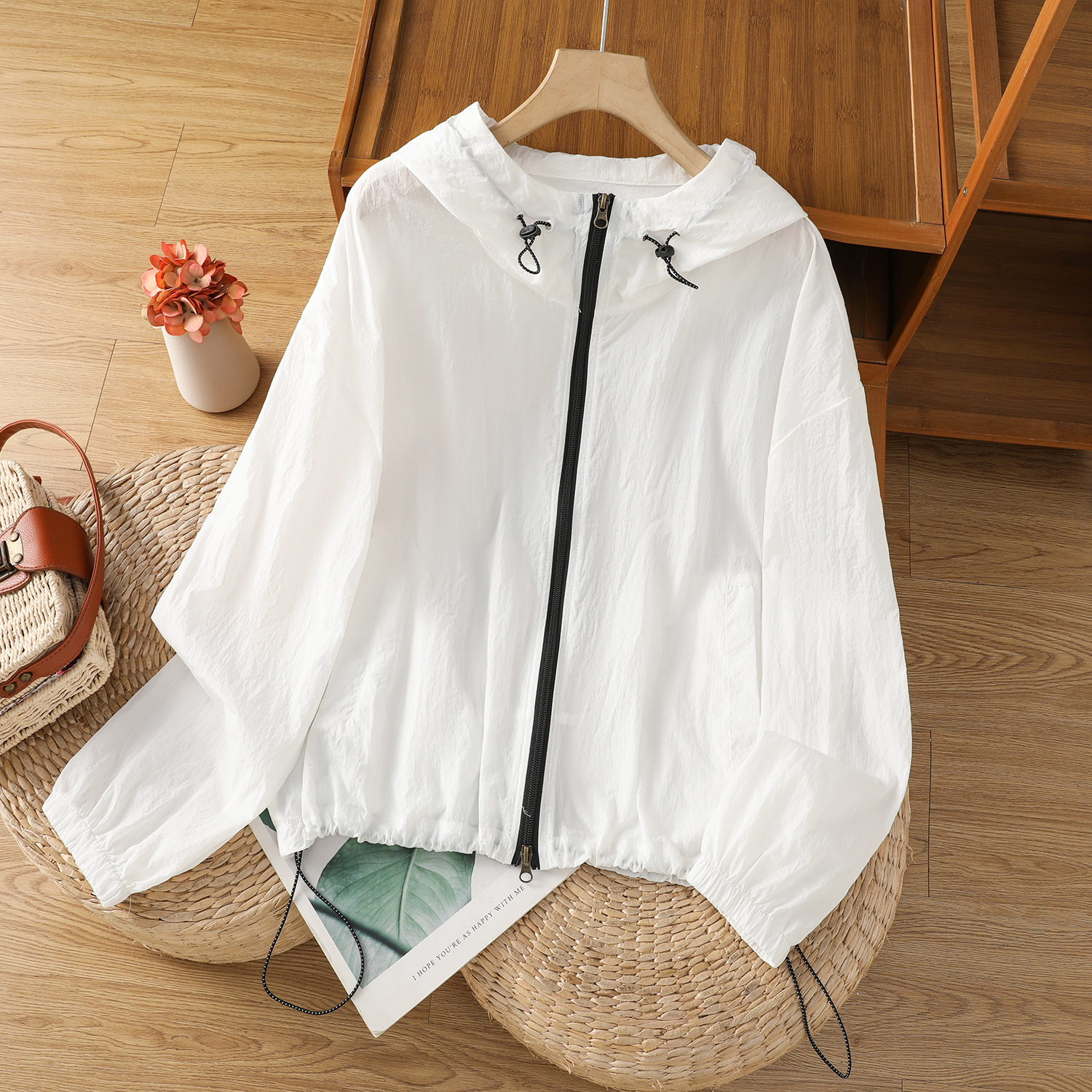 在庫ありファッショナブルなフード付き通気性日焼け止めジャケットカラーブロックジッパー巾着薄手カーディガン長袖トップアウター
