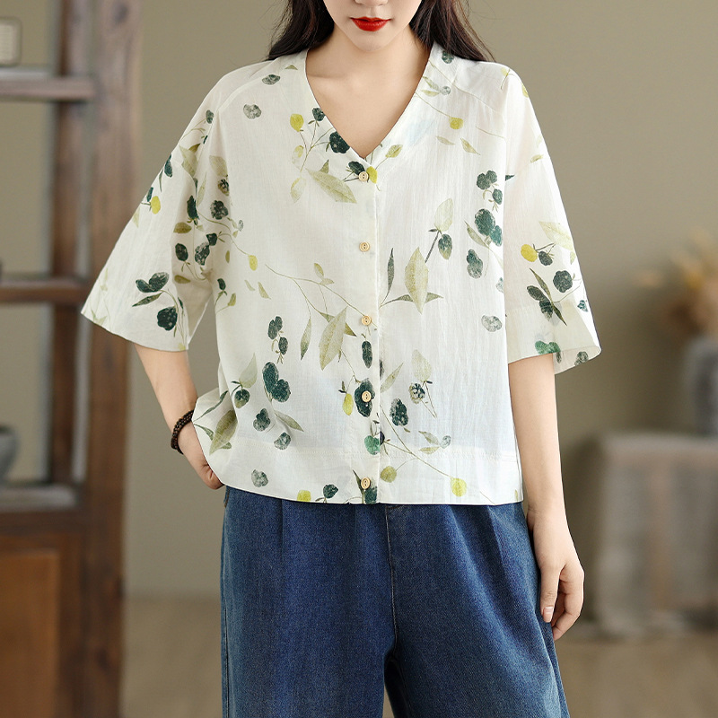スポットレトロプリント 100% ラミーシャツショートジャケットレディース夏薄手襟シャツカーディガンアウター