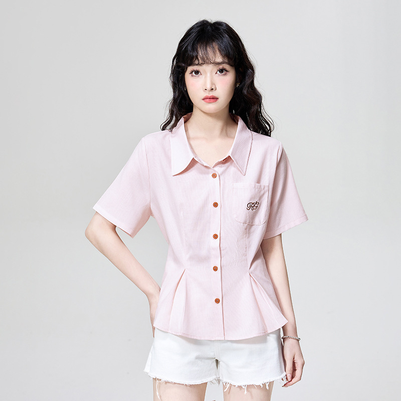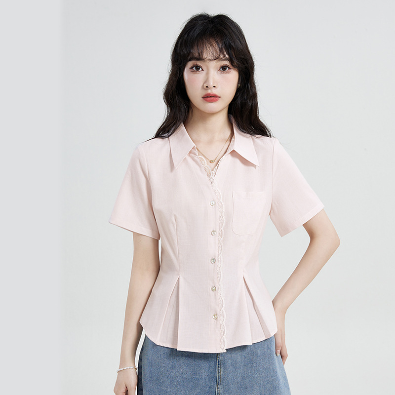 在庫あり〜2025年新作ピンクフレンチレースパッチワークシャツウエスト痩身半袖シャツ