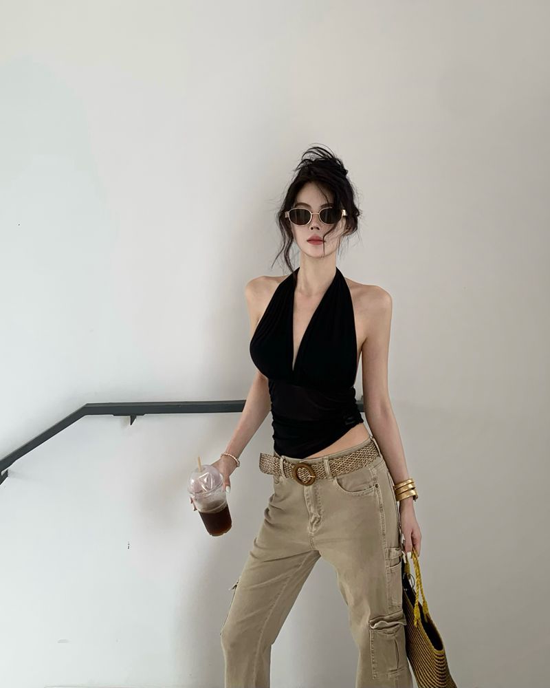 在庫あり、春のホルターネックキャミソールホットガールセクシーカラープリーツウエスト痩身高弾性メッシュトップ