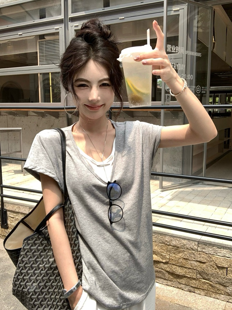 在庫あり、コントラストカラーのフェイクツーピースレイヤードルーズ半袖シャツ、女性用カジュアルレイジートップ