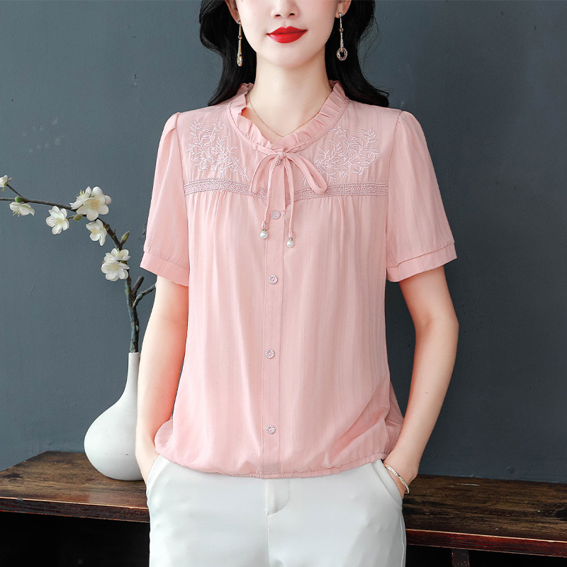 在庫あり若い母親のスタンドカラー刺繍半袖プルオーバーシフォンシャツ新しいスタイルの女性の夏の多用途シャツ