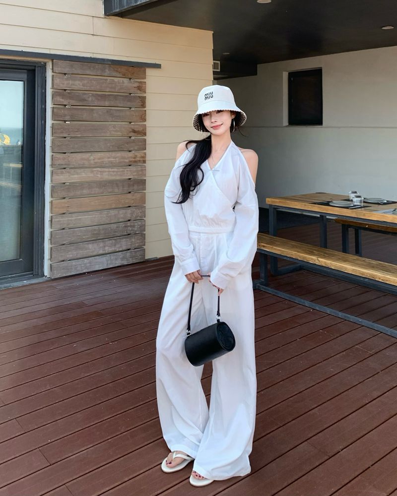 既製品のオールドマネースタイルデザインカラーホルターネックオフショルダー長袖シャツ+ゆったりカジュアルワイドレッグパンツスーツ