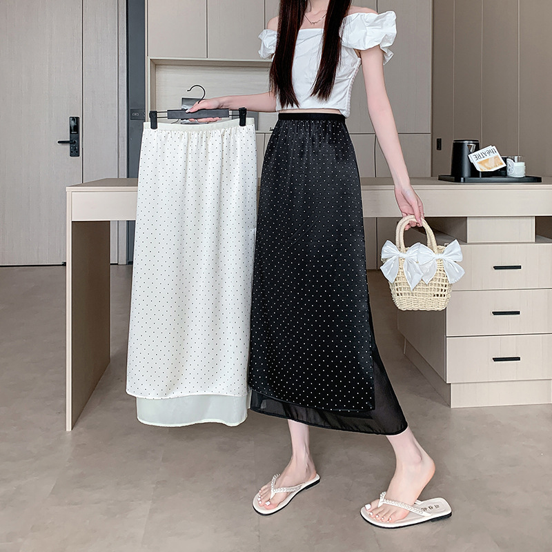 スポットビデオ韓国風優しくスリムで万能な水玉スカートサテンステッチデザインウエストゴムスカート