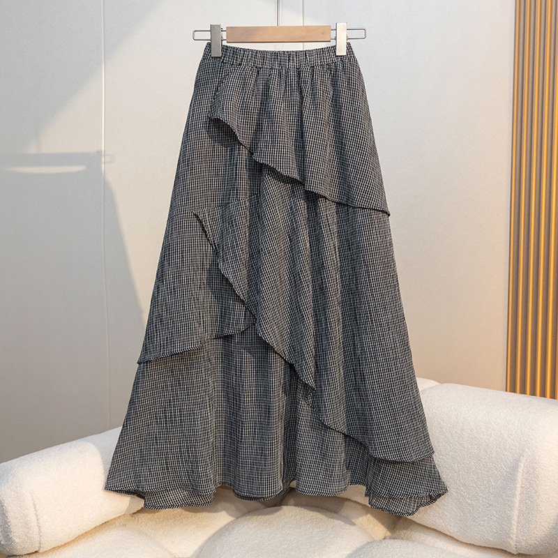 在庫あり 2025 春夏韓国レトロチェック柄不規則なミドル丈大裾ハーフ丈アンブレラスカート