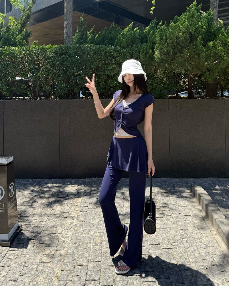スイートスリムフィットレース半袖シャツ+フェイクツーピースフリルスリムフレアパンツスーツ
