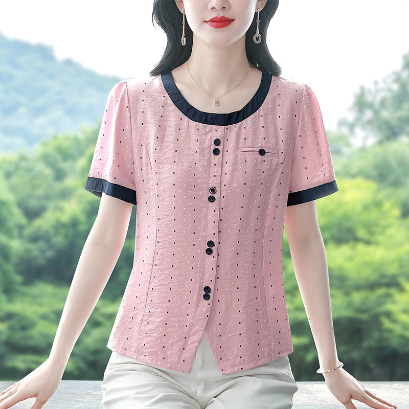 スポットラウンドネックシャツ綿とリネンの水玉模様のレディース夏服新しい半袖トップスショートスリムで多用途なシャツ
