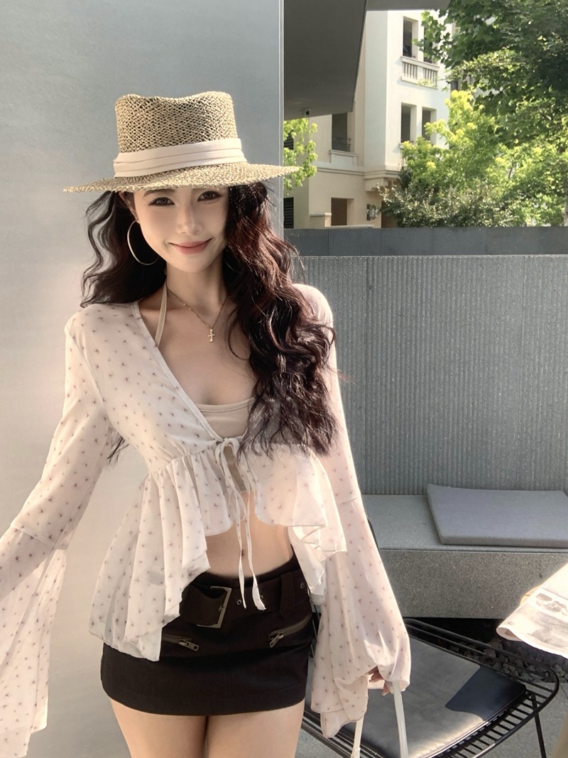 スイートホリデースタイルの襟付き花柄ウエストフリルシフォンシャツ女性用、透視ベルスリーブトップ