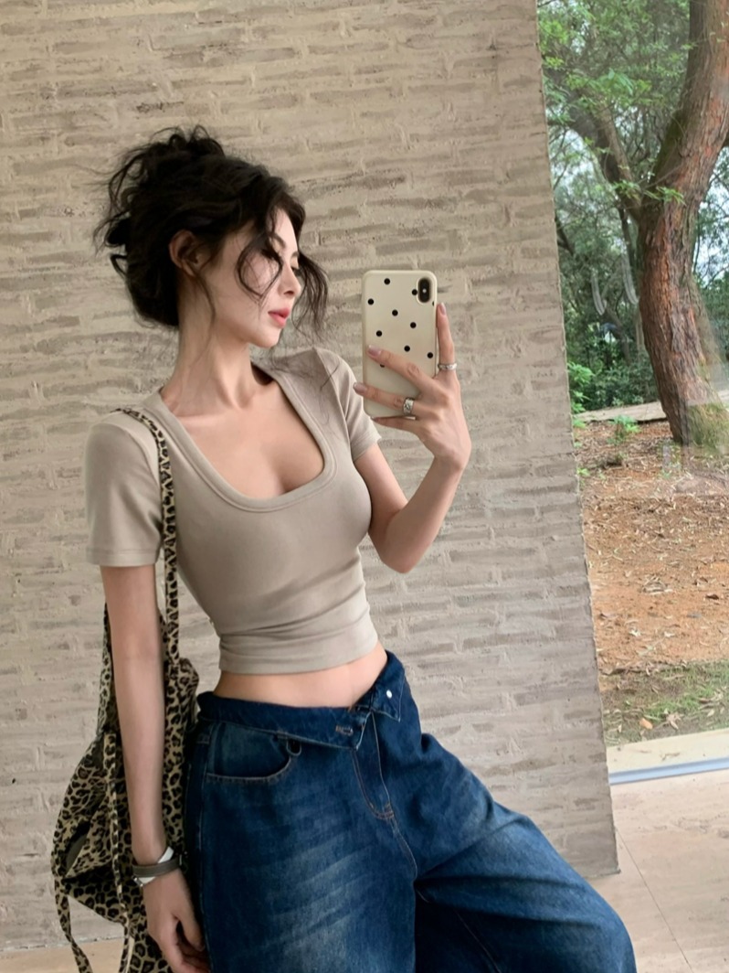在庫あり、夏のシンプルベーシックスタイル、スリムフィット、ローネック、ショート半袖シャツ、フェミニンなおへそ出しトップス