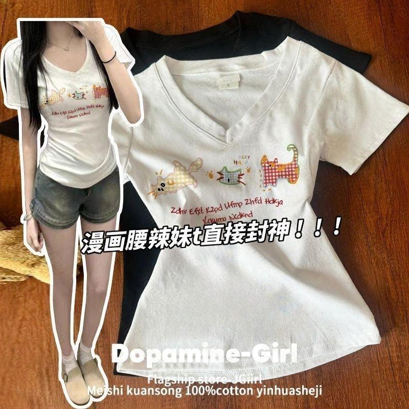 2025 新作夏アメリカンショルダー V ネックプリント Tシャツレディース半袖スリムウエストシンプルインナー無地トップ