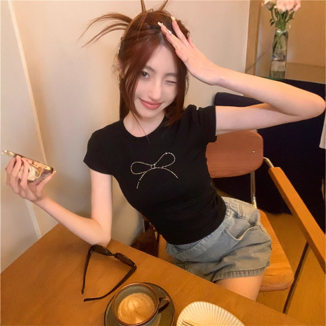 2024 夏アメリカンホットガール半袖 Tシャツレディースへそ出し黒リボンホットダイヤモンドスリムショートトップトレンディ