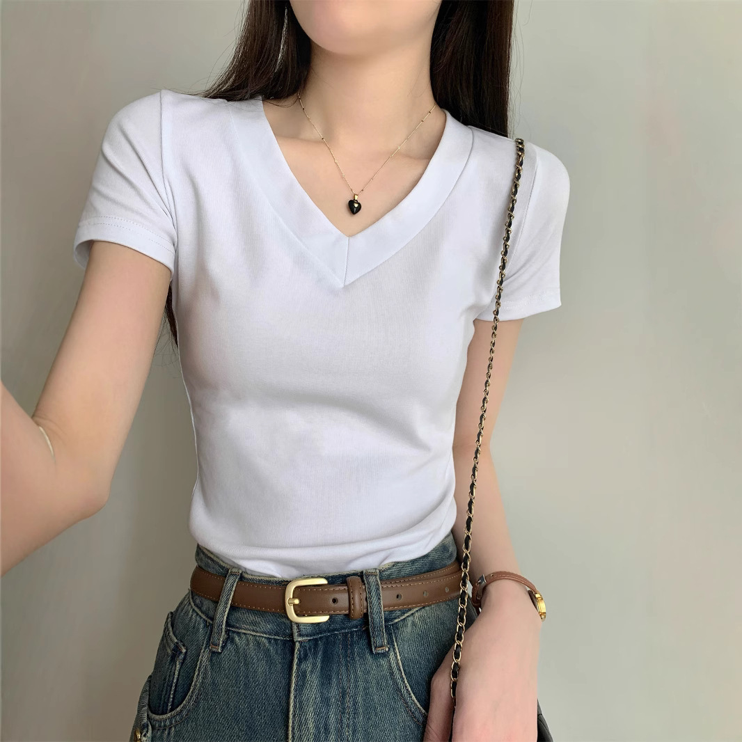 2025 夏の新アメリカンレトロスリムフィット V ネック半袖 Tシャツ女性の無地ベーシック多用途痩身トップ