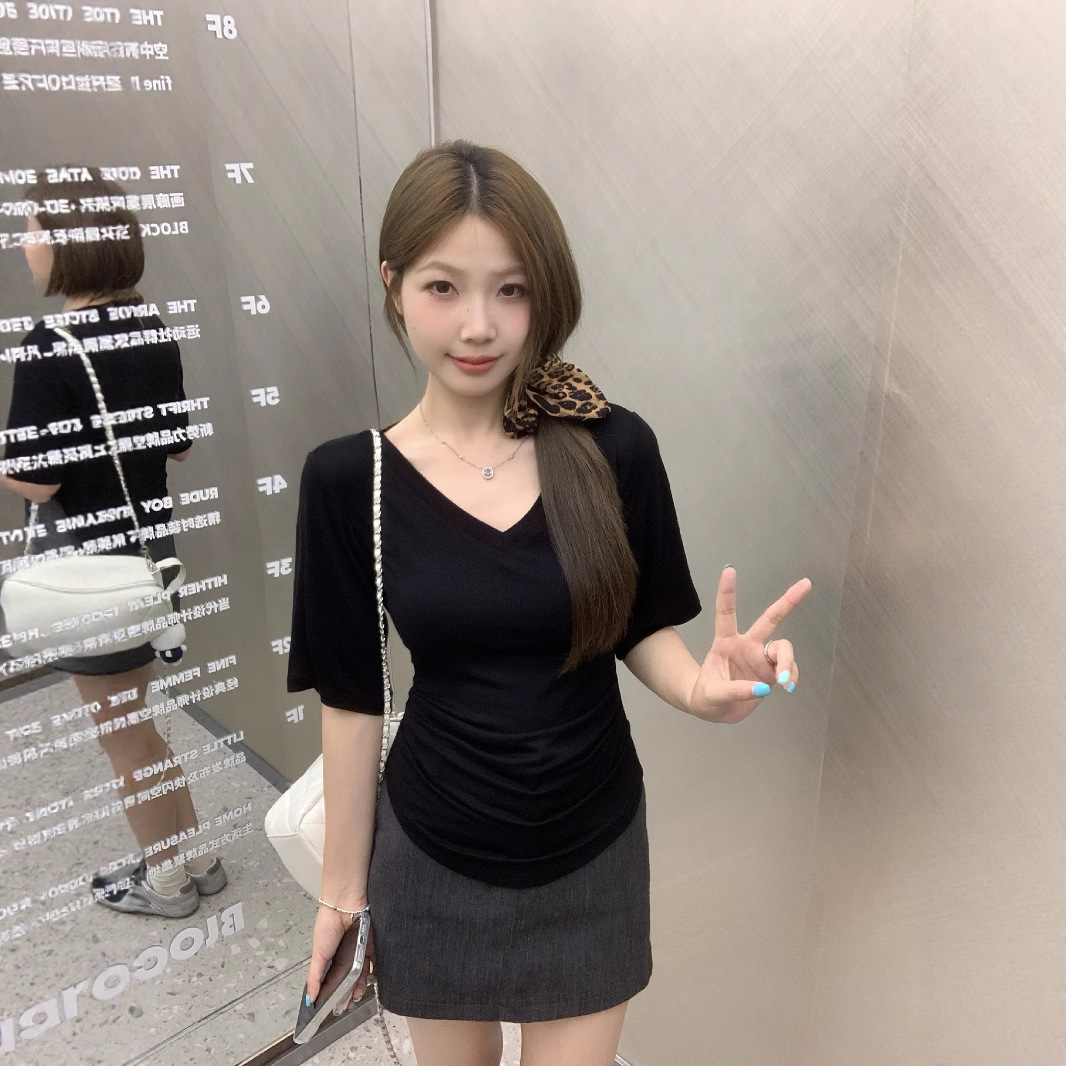デザインされたスイングスリーブプリーツスリムボトムストップス女性用夏大きいサイズファットmmフレンチピュアディザイアかわいい半袖Tシャツ