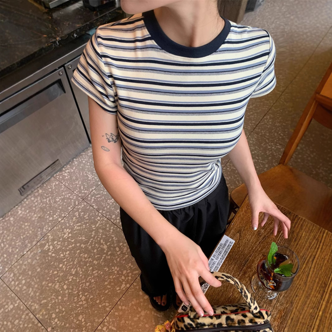 ストライプ Tシャツ半袖レディース夏服 2024 新しいラウンドネックルーズイン控えめなスタイルシンプルな学生トップ