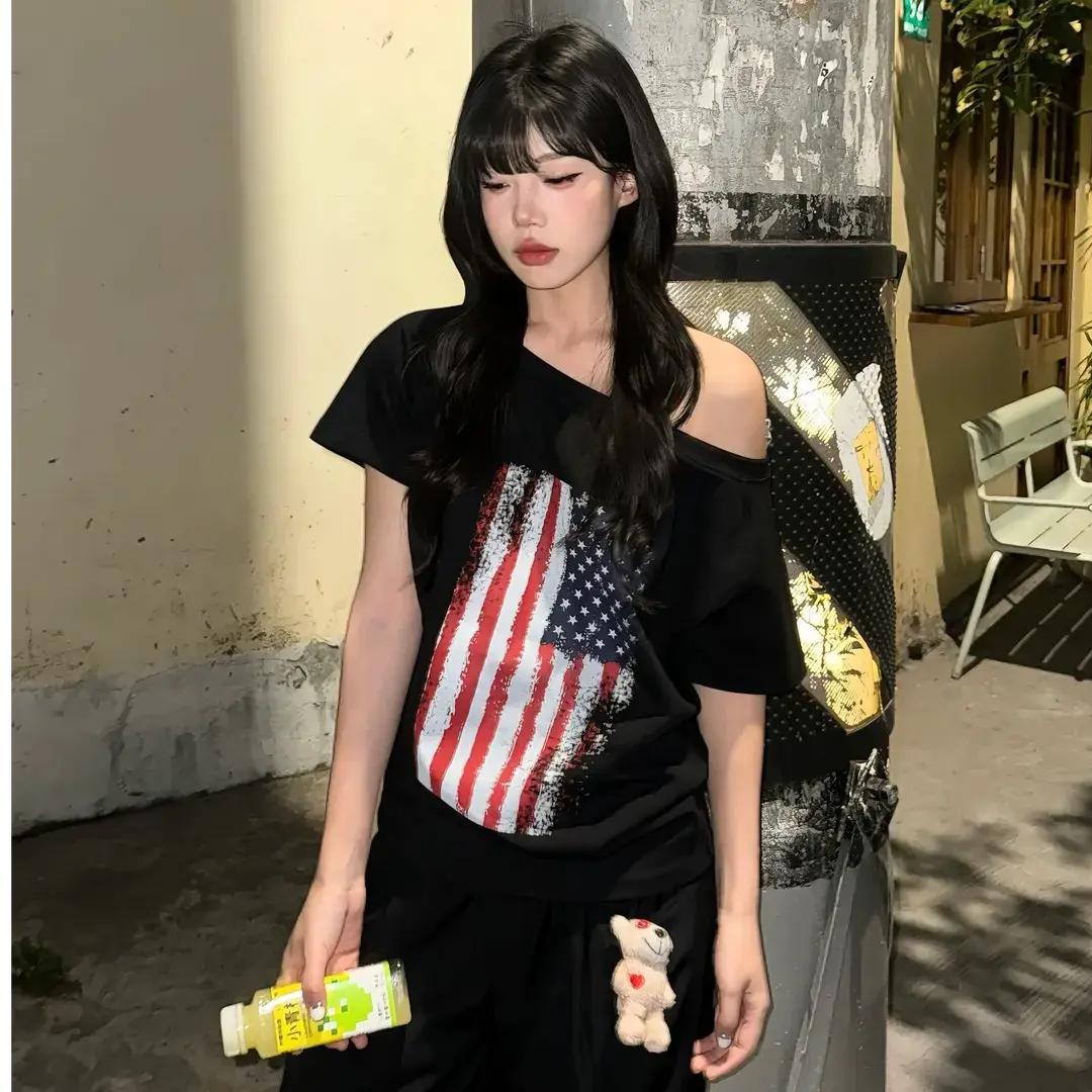 アメリカンレトロストリートフラッグオフショルダー半袖Tシャツレディース夏ルーズホットガール甘くてクールなデザインオフショルダートップ
