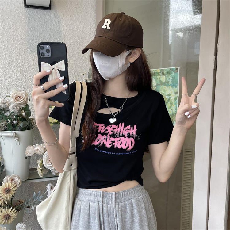 アメリカンホットガール中空ショートTシャツレディース2024年夏新デザインスリムフィット半袖学生トップ