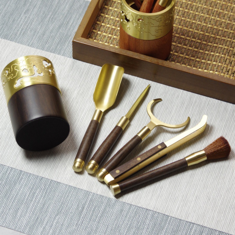 真鍮茶道六君子セット無垢材茶クリップティースプーンティーナイフポットペン真鍮クリップカンフーティーセットアクセサリー