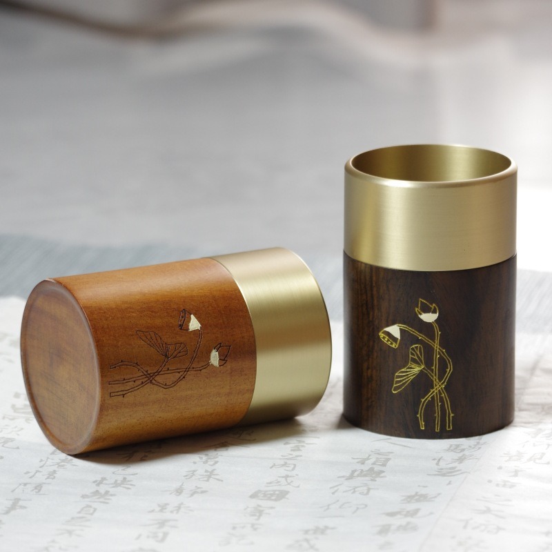 茶道六君子銅木茶筒付属品高級功夫茶道具収納筒家庭用真鍮茶筒君子置物