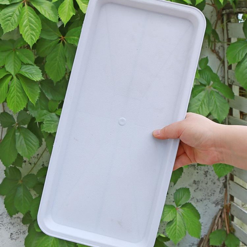 厚いプラスチックの長方形の植木鉢のトレーの水受け皿の底から水が漏れます。