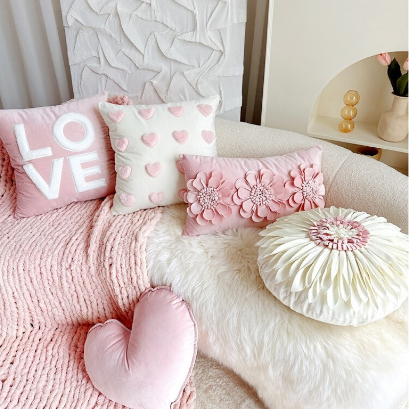 フランスの新しい花は枕のピンクのぬいぐるみの少女の心の客間のソファーの愛のクッションのベッドの上でかわいい枕カバーを抱きます。