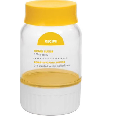 自家製のバター機の台所用品のコップの姜黄色の手でバターをかき混ぜます。