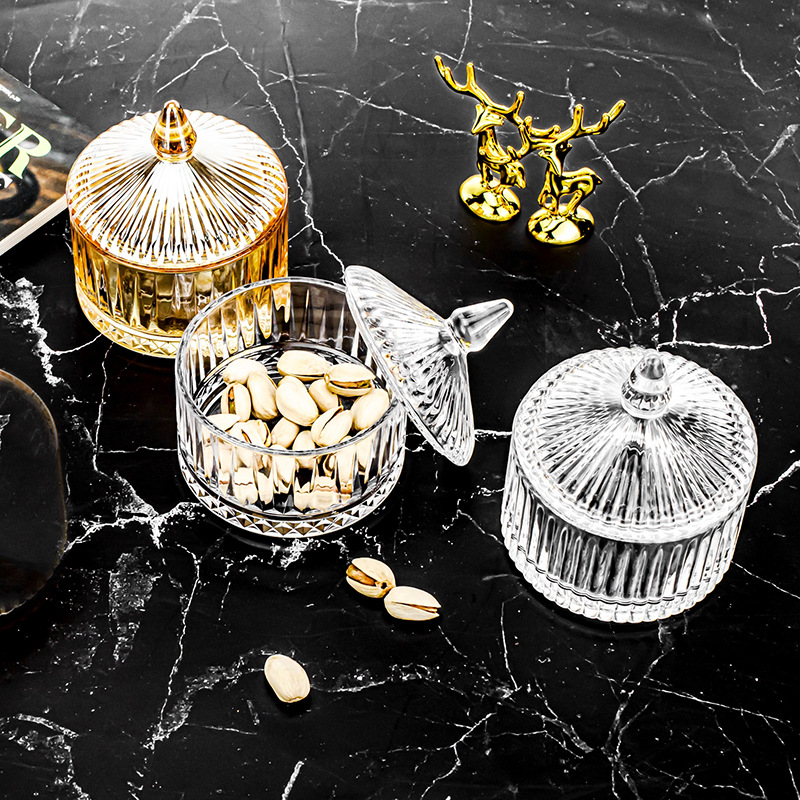 新しいガラスのキャンディー缶の剣の紋様の砂糖のかめの縦のストライプのキャンディーの杯の方の砂糖の缶の貯蔵箱の貯蔵箱