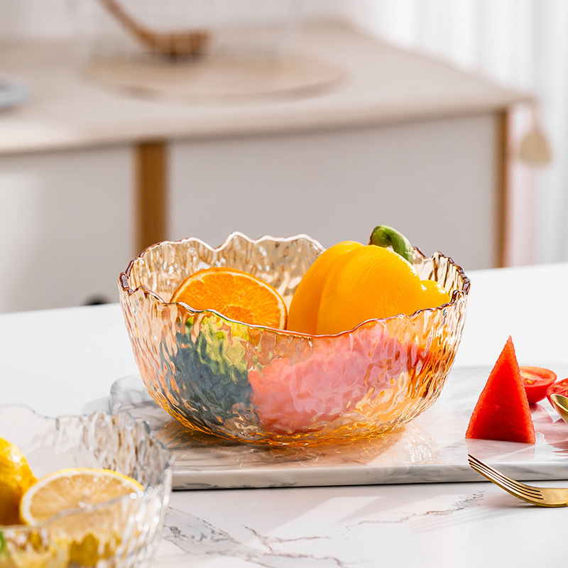 サラダ碗の日本式のハンマーのガラスの碗の果物と野菜の碗の果物の丁碗のまぶしい色のins風の不規則なガラスの口のお茶の海