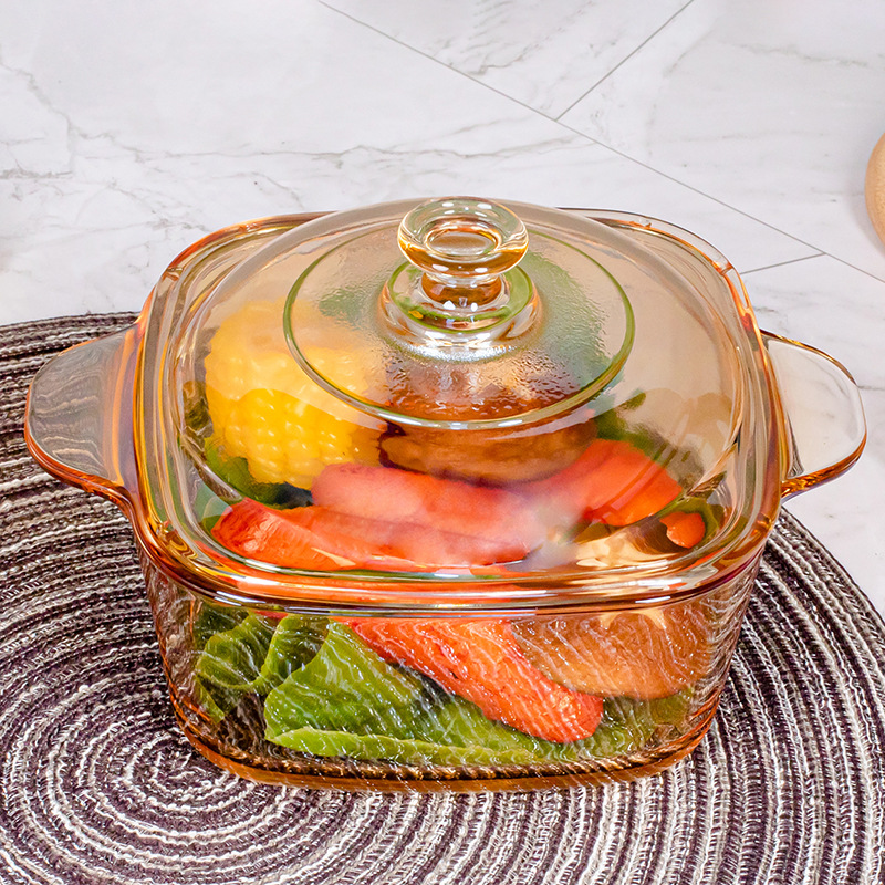 ガラスの鍋は高温に耐えられます。マイクロ波は蓋付きの両耳のガラススープの碗の琥珀色の泡の碗の食事のサラダの碗を適用します。