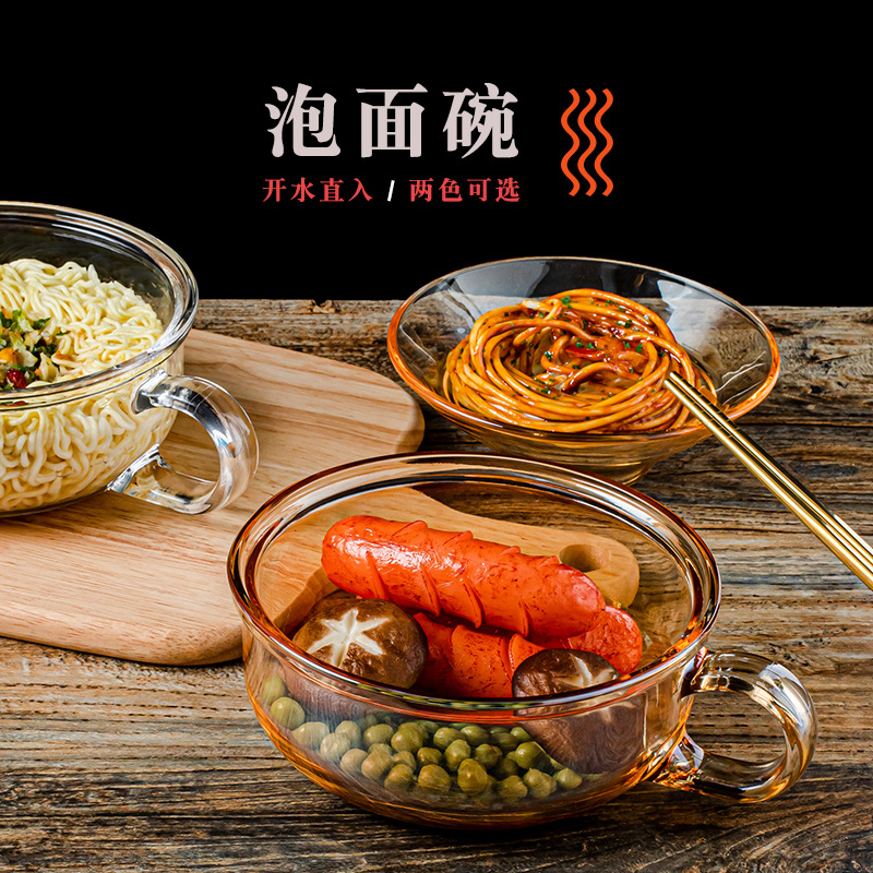 インスタントラーメンとインスタントラーメンのガラス碗の学生食堂の食堂の碗は弁当箱を持っています。