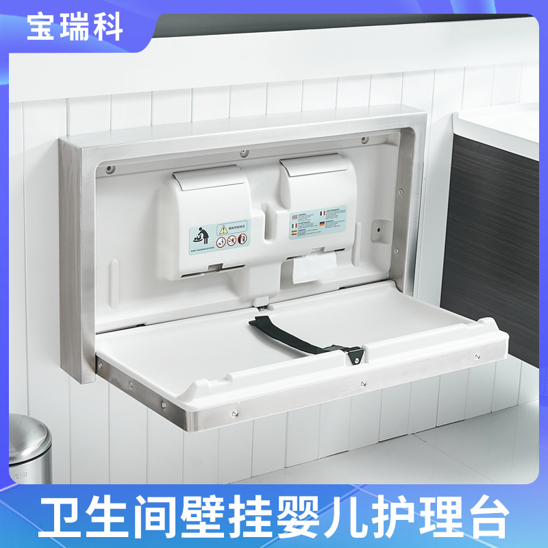 第三トイレのベビーケア台の壁掛けステンレスの穴を開けて、母子室のおむつ交換ベッドの埋め込み式の暗い服を作ります。