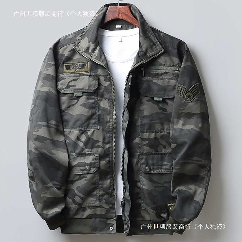 迷彩服の作業服の男性は一枚の上着を着ています。