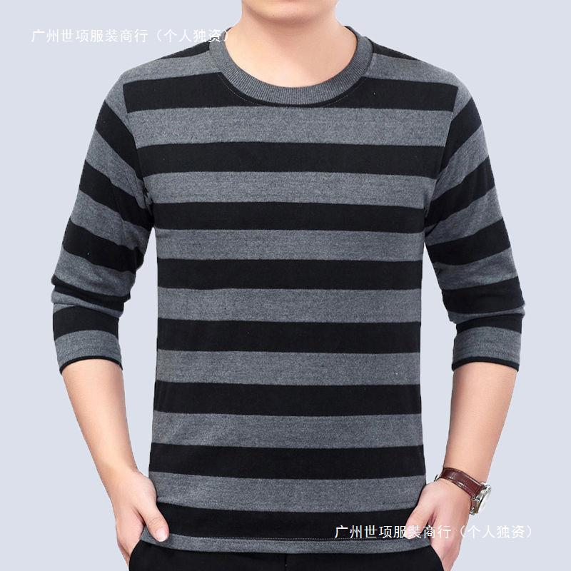 メンズ長袖tシャツ丸襟春ボトムシャツ綿質ストライプニット中年カジュアル秋服上着