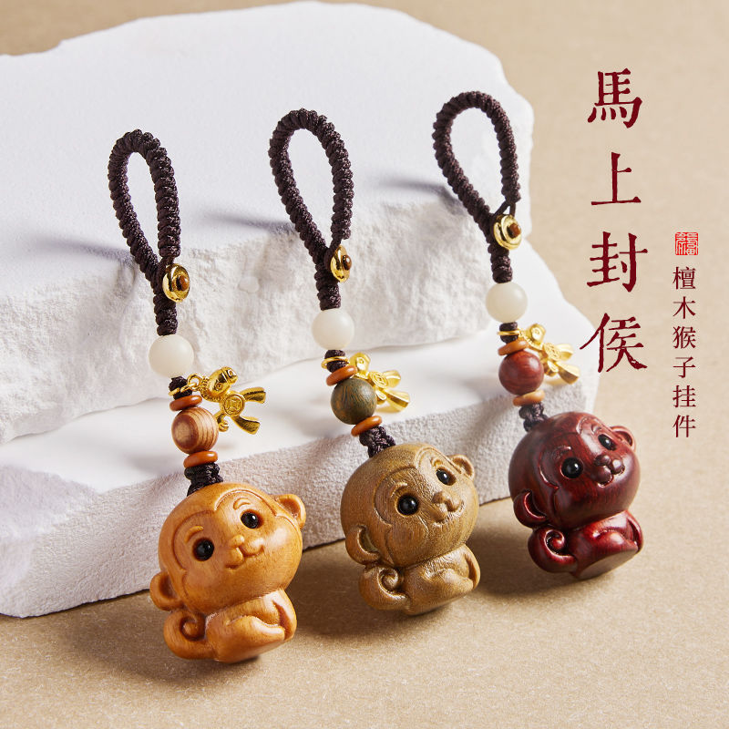 【即封侯】檀木生肖猿自動車キーホルダー男女ストラップ小猿携帯電話ストラップ