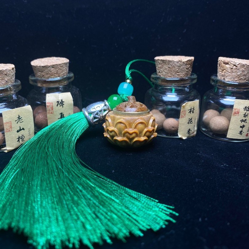 一心香舎の携帯チェーンの緑檀連生の香嚢の携帯チェーン (4本の香丸を送って、流蘇の色は従います。
