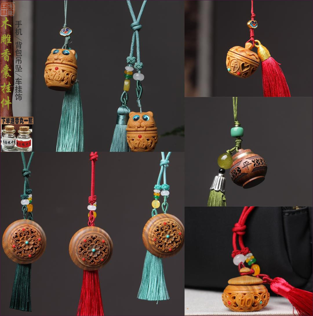 緑檀バービー檀香木質香嚢球透かし彫り携帯電話ペンダント自動車キーホルダーストラップバックパックアクセサリー