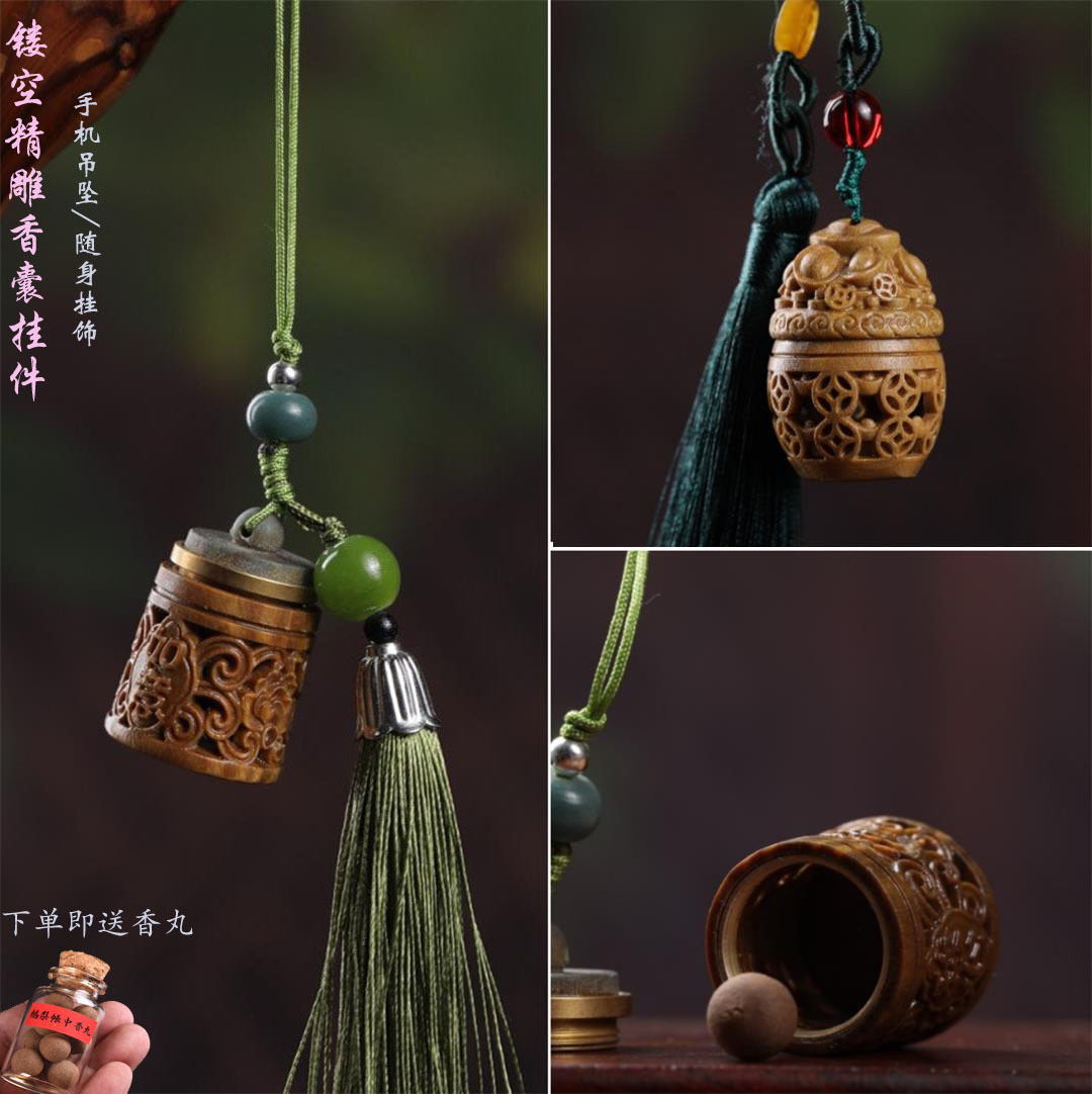 緑檀の木製の透かし彫りの香嚢の玉の薫香丸の復古風の車内のストラップの携帯電話のペンダントの女性のリュックサックのアクセサリー