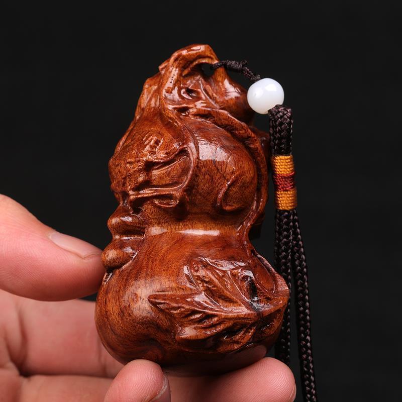 ラオスの黄花梨の木の彫刻の瓢箪の置物の手の件の多子の多福の工芸品のペンダントは黒い縄を送ります。