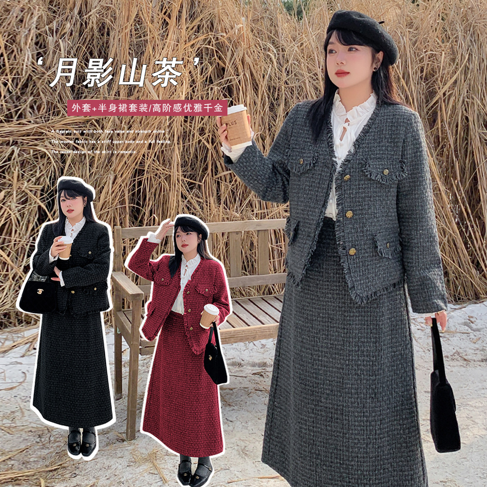 7945軒辰の大きいサイズの婦人服の太ったMMの冬の新型の厚い香りの風は厚いフリンジの上着の半身のスカートのスーツを厚くします。