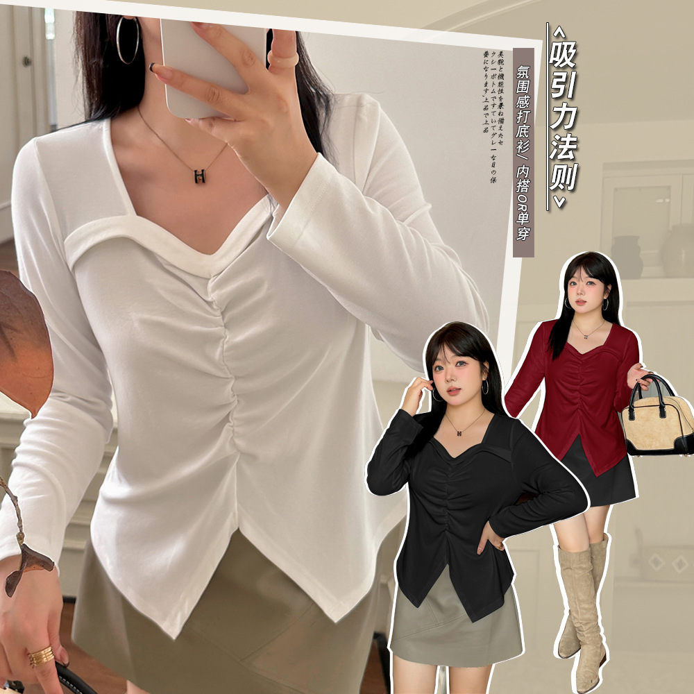 W 1231軒辰微太った大コードの韓国版デザイン感は、タックの底のシャツの秋の新型の太ったMMの肉を遮る長袖の上着をつまみます。