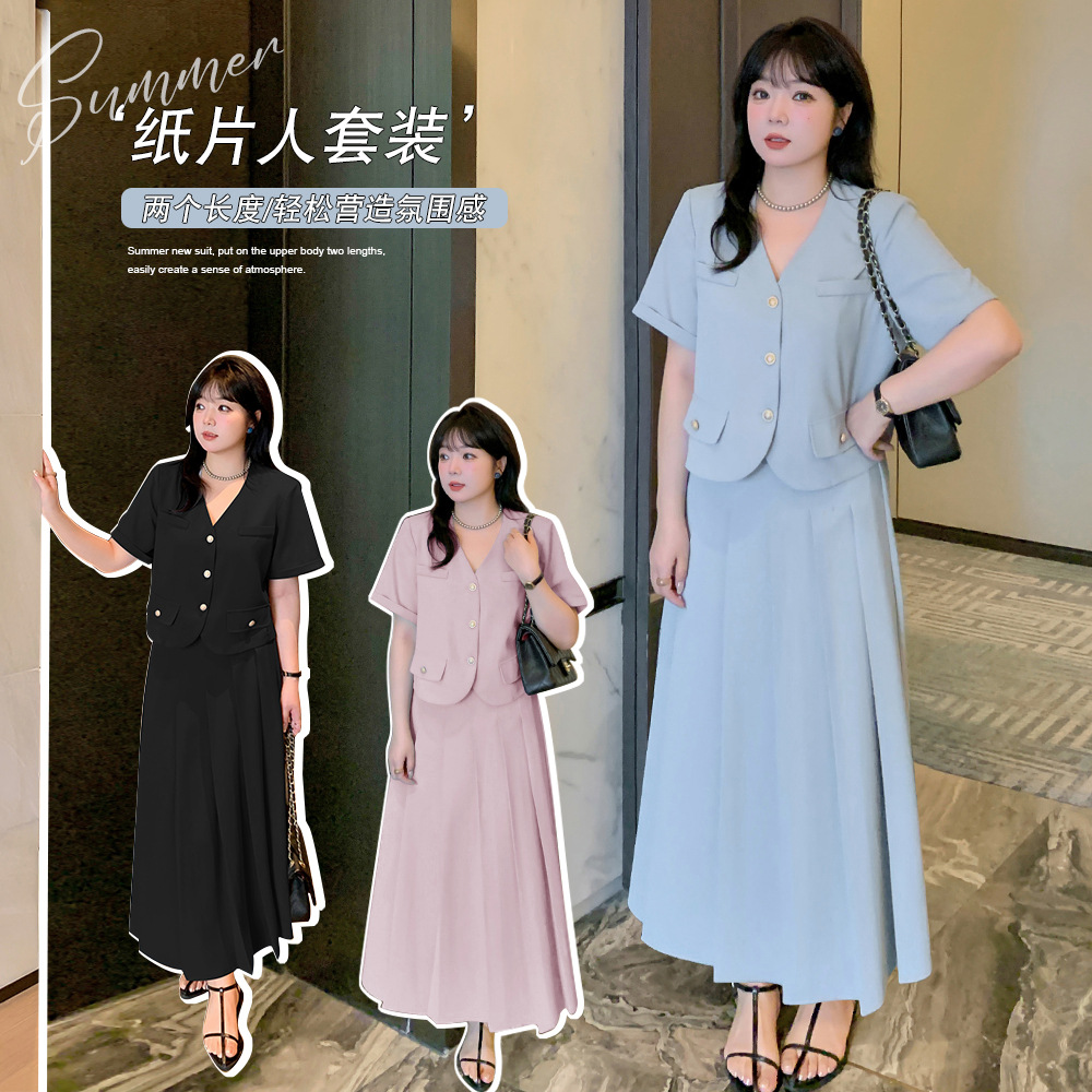 7907 やや太めの夏の新作プリーツスカート ツーピースデザイン婦人服プラスサイズ 100kg ペーパーマンスーツ-BFD