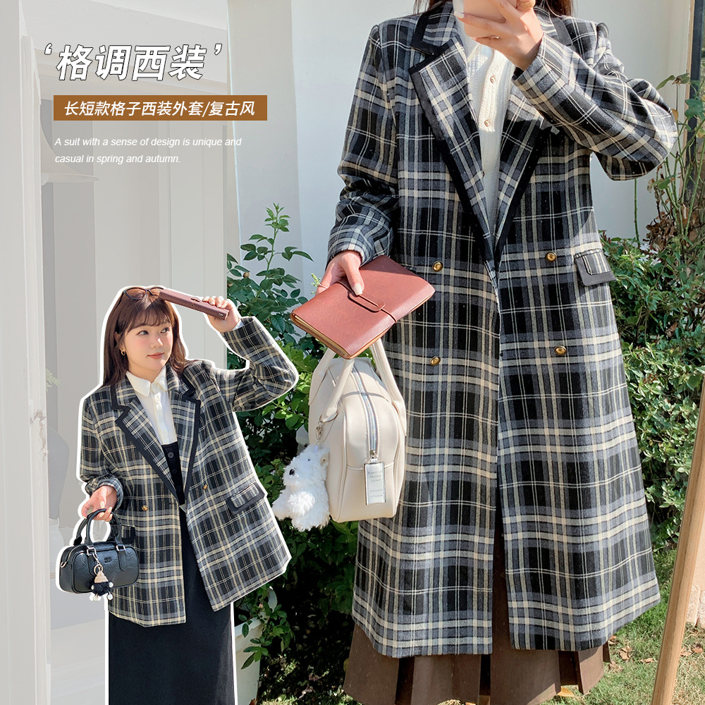 A0068 輝晨微太体型大码韓版通勤OLレトロチェック柄スーツ秋100kgロング&ショートジャケット-BFD