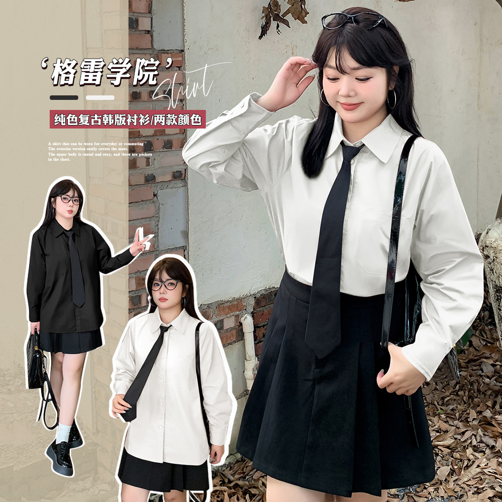 W1232 輝晨微太体型向け韓国風ゆったり長袖カジュアル無地シャツ 秋の新作体型カバーシャツ