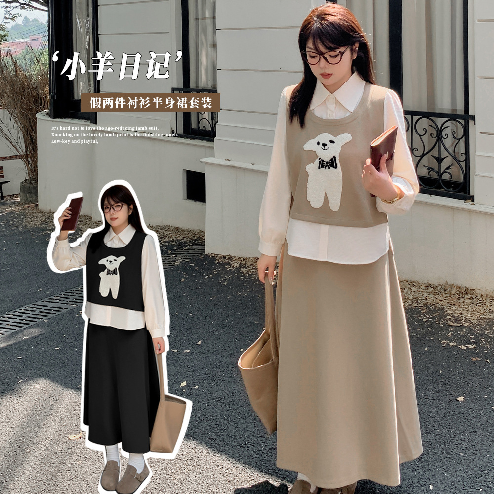 7937 華晨 秋物 レディース 大きいサイズ プラスサイズ レトロ 優しい雰囲気 フェイクツーピース シャツトップス ミニスカート セットアップ-BFD