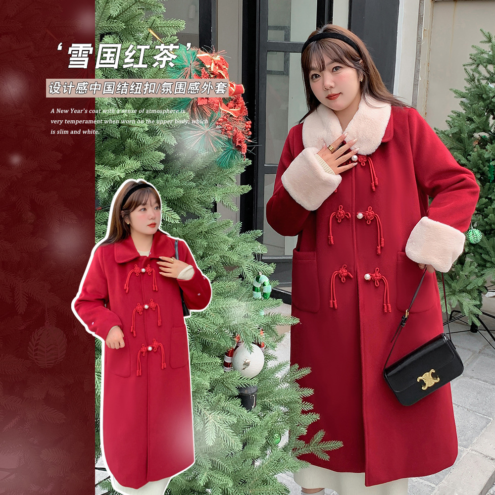 A0066詩銘洛可冬新商品国風新年服気質赤コート雰囲気感ミディアムウールコート