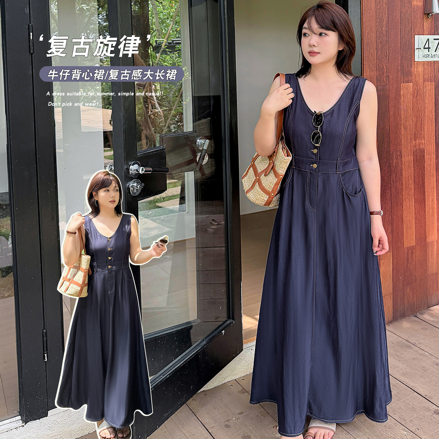 7968Xuanchen 夏の新作大きいサイズ婦人服プラスサイズタンクトップワンピース 100kg デニムロングスカートハイウエスト着痩せ効果のある女性用スカート