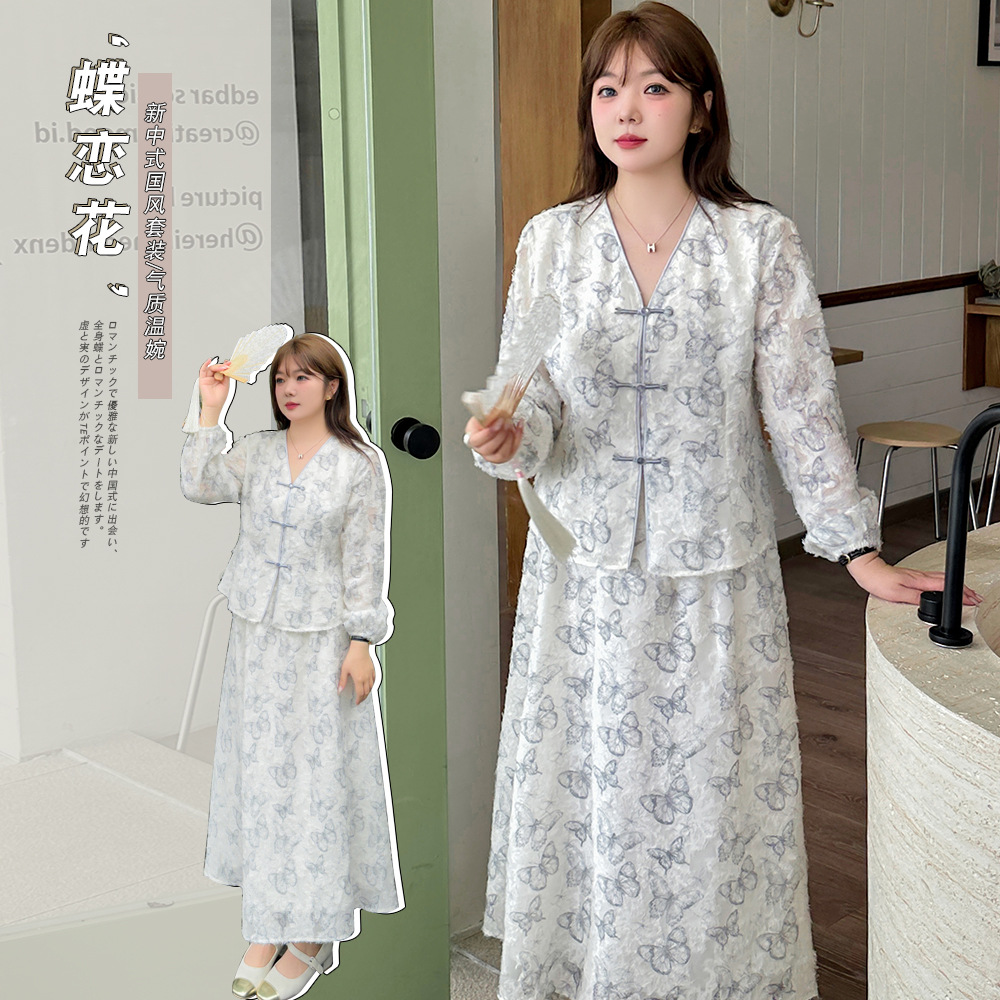 2396軒辰新中国式蝶盤ボタンvネックセット女性夏タイプ太ったmmシャツ茶系スカート2セット