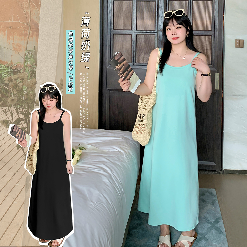 W1148微太っ軒辰女太ったmmカジュアルな夏の純色ミントマンボの新しいストラップの長いワンピース