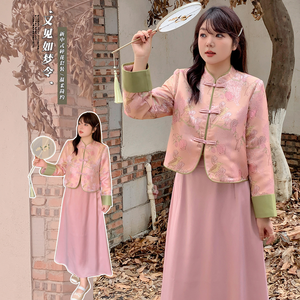 2431新年装太った女の子向けプラスサイズ、着痩せ効果のあるツーピースセット、中国風スカート、工場卸売、一件代発送