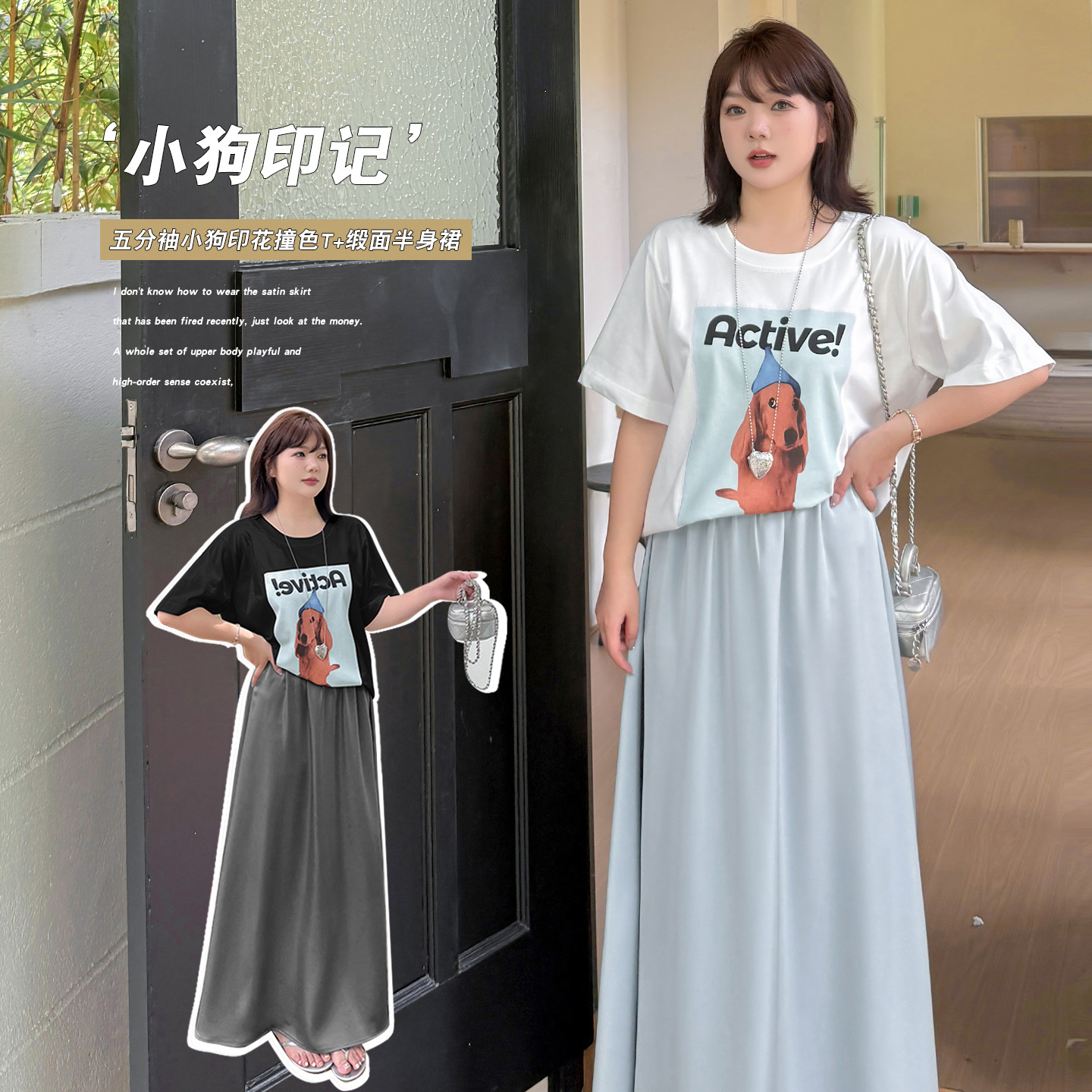 7975轩辰夏 新款胖MM大码女装薄款小狗T恤短袖上衣纯色缎面裙套装
